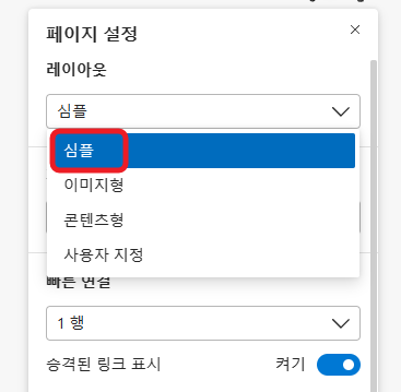 2. [페이지 설정]- [레이아웃]에서 '콘텐츠형'을 '심플'로 바꾼다.