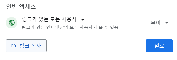 - '링크 복사'를 클릭합니다. 그러면 클립보드에 이 구글 문서의 링크가 복사된 상태입니다.