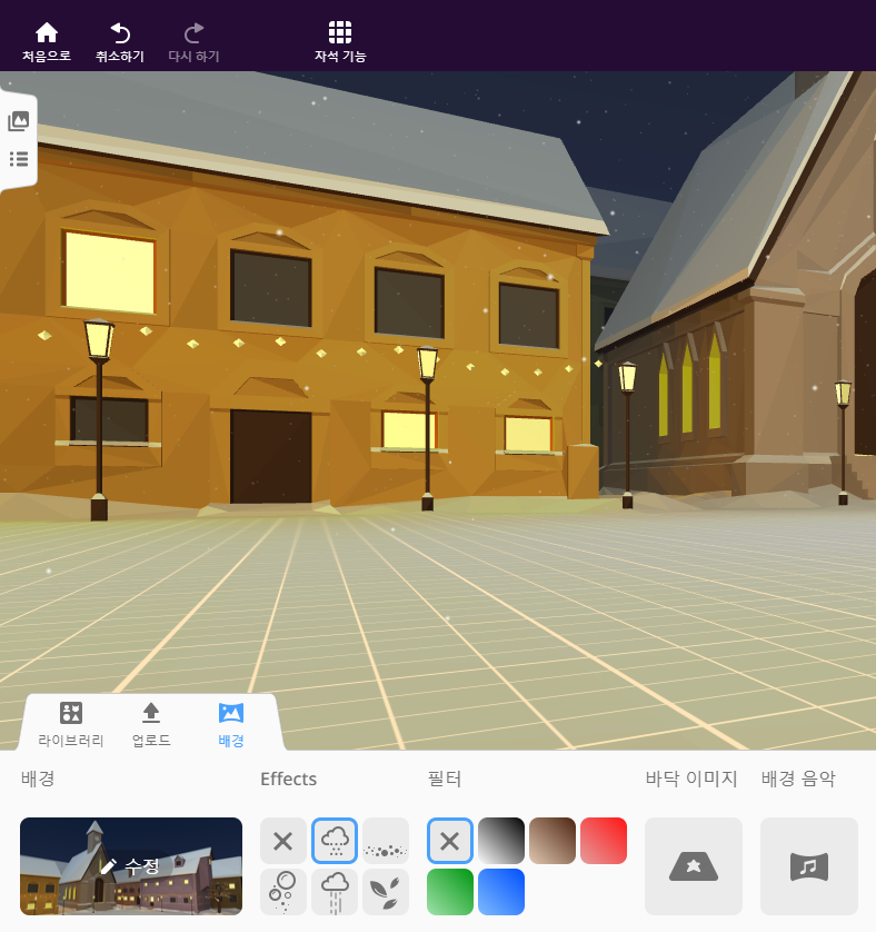 이렇게 배경 하나를 선택했더니, 정말 실감이 납니다. 눈 오는 설정도 가능해요. 마우스 휠을 조정하면 보이는 시야가 달라지는데요. 오른쪽 사진으로 보이는 격자무늬(그리드)가 바로 우리의 작업 공간이 됩니다. 여기 안에서 무엇이든 만들 수 있어요.