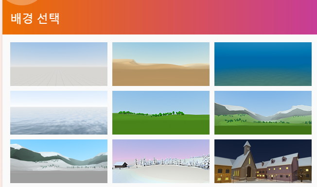 배경을 선택해 주세요. 사막부터, 눈 오는 마을까지 매우 다양해요!