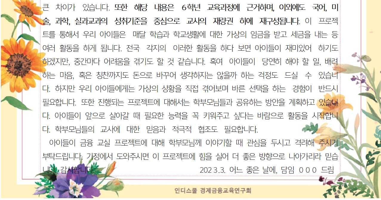 이에 경제금융교육 연구회에서는 다음과 같이 학부모 안내장을 만들어 배포하고 있습니다.